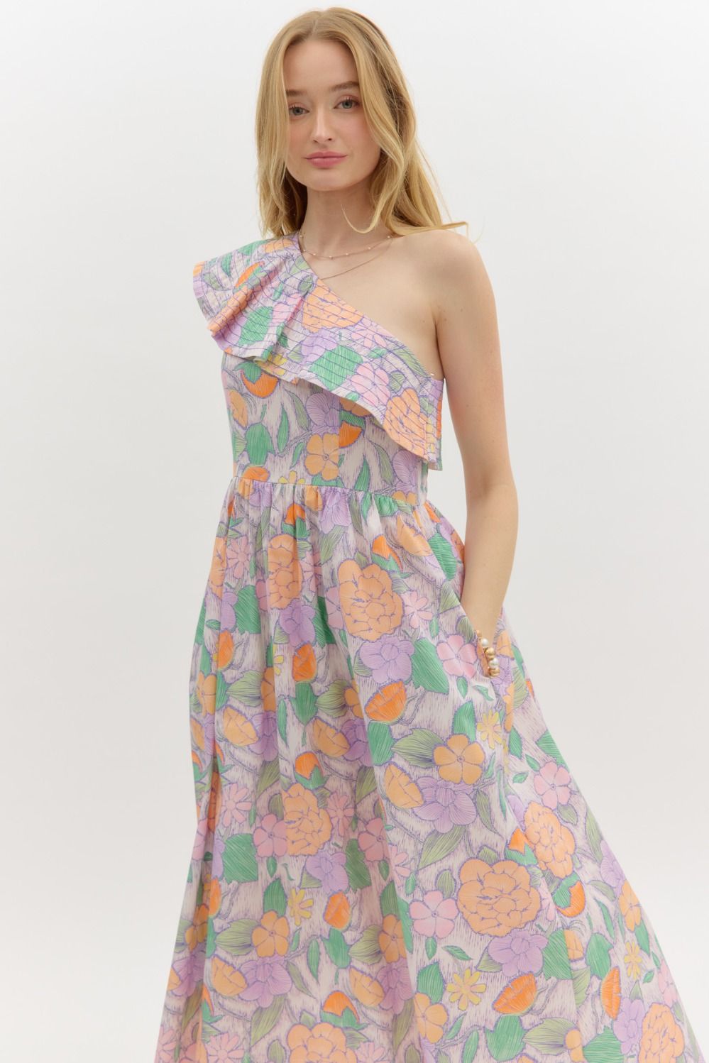 Floral print one shoulder midi dress featuring exposed stitch detail accented flutter ruffle neckline. Side zipper closure. Pockets at sides. Lined. Woven. Non-sheer. Lightweight.