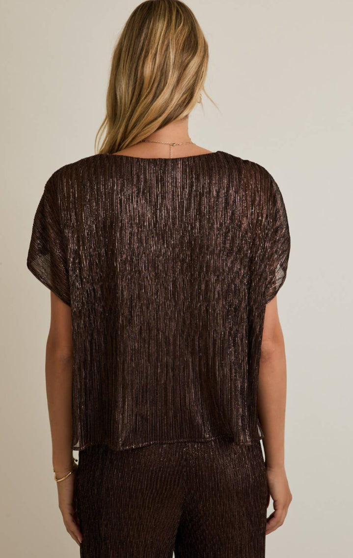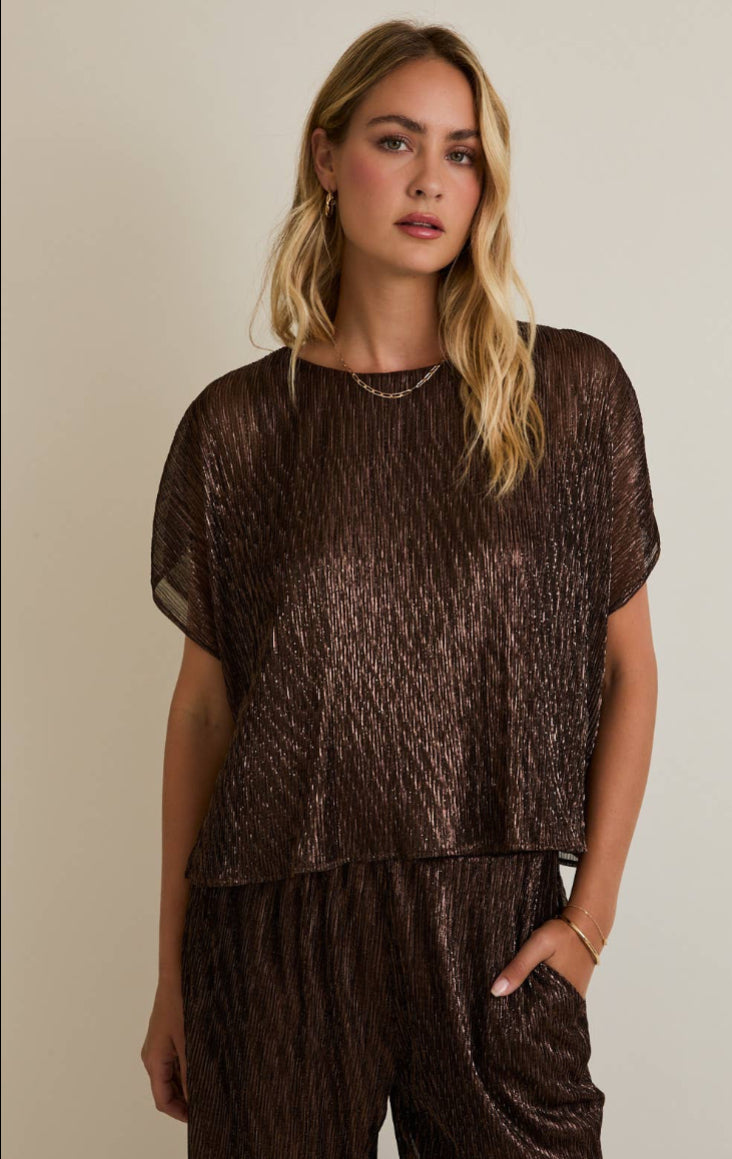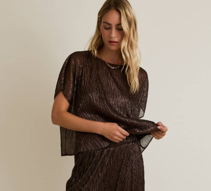 Shine bright in this fun metallic cropped boxy top that's ready to turn heads. The relaxed, boxy silhouette keeps things cool and comfortable while the shimmering finish adds instant glam to any outfit. Pair it back with our matching pants for a coordinated look that's totally on-trend. Perfect for nights out, festivals, or whenever you want to add some sparkle to your style.