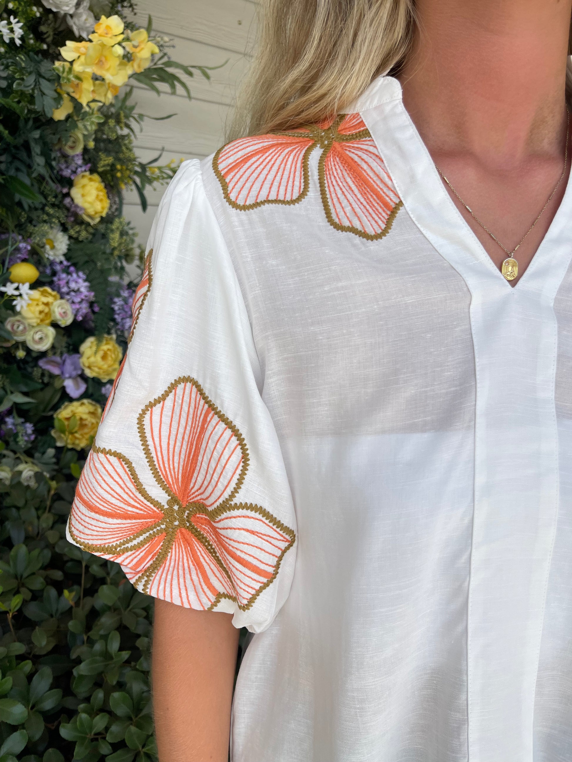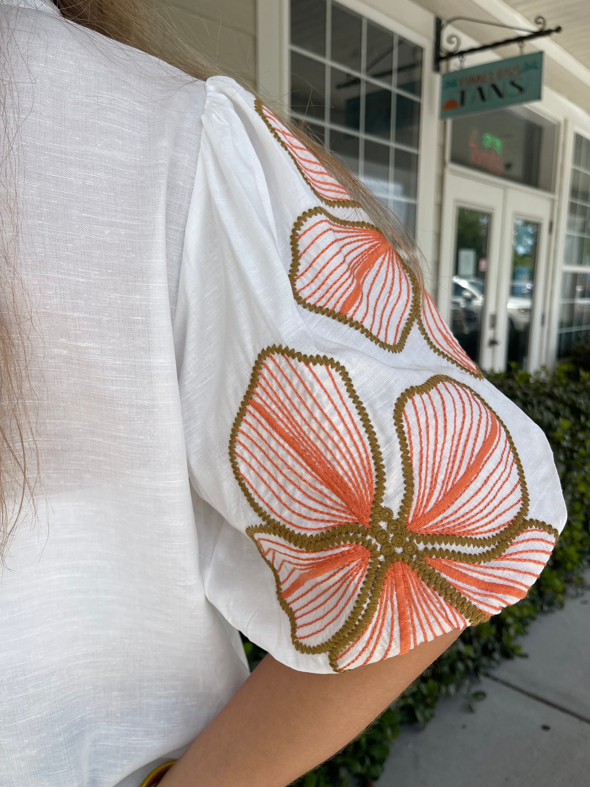 This playful Big Island Top features lightweight white fabric ( a bit sheer) and charming full short sleeves adorned with delicate floral embroidery. Perfect for adding a touch of fun and freshness to your warm-weather wardrobe.