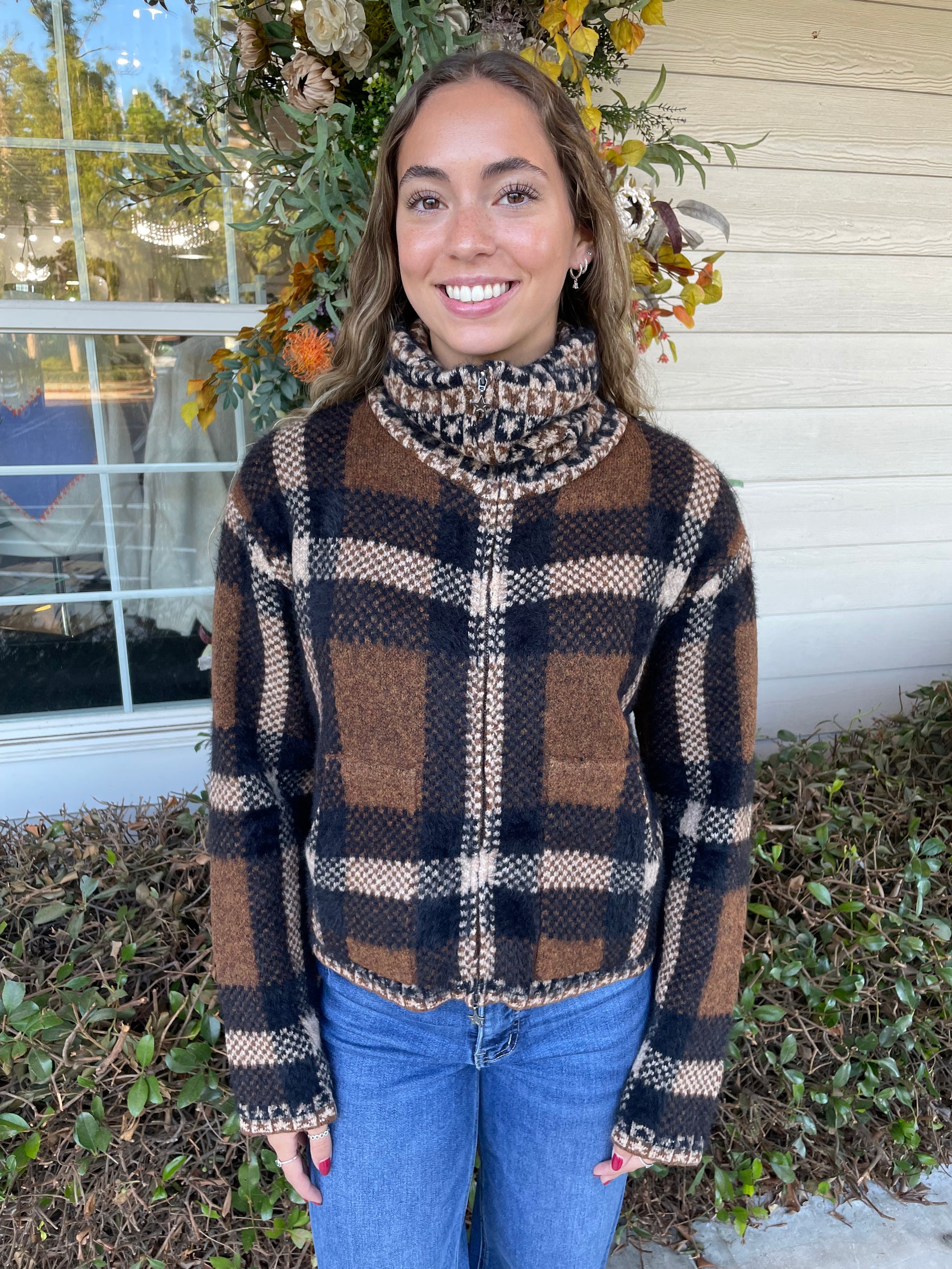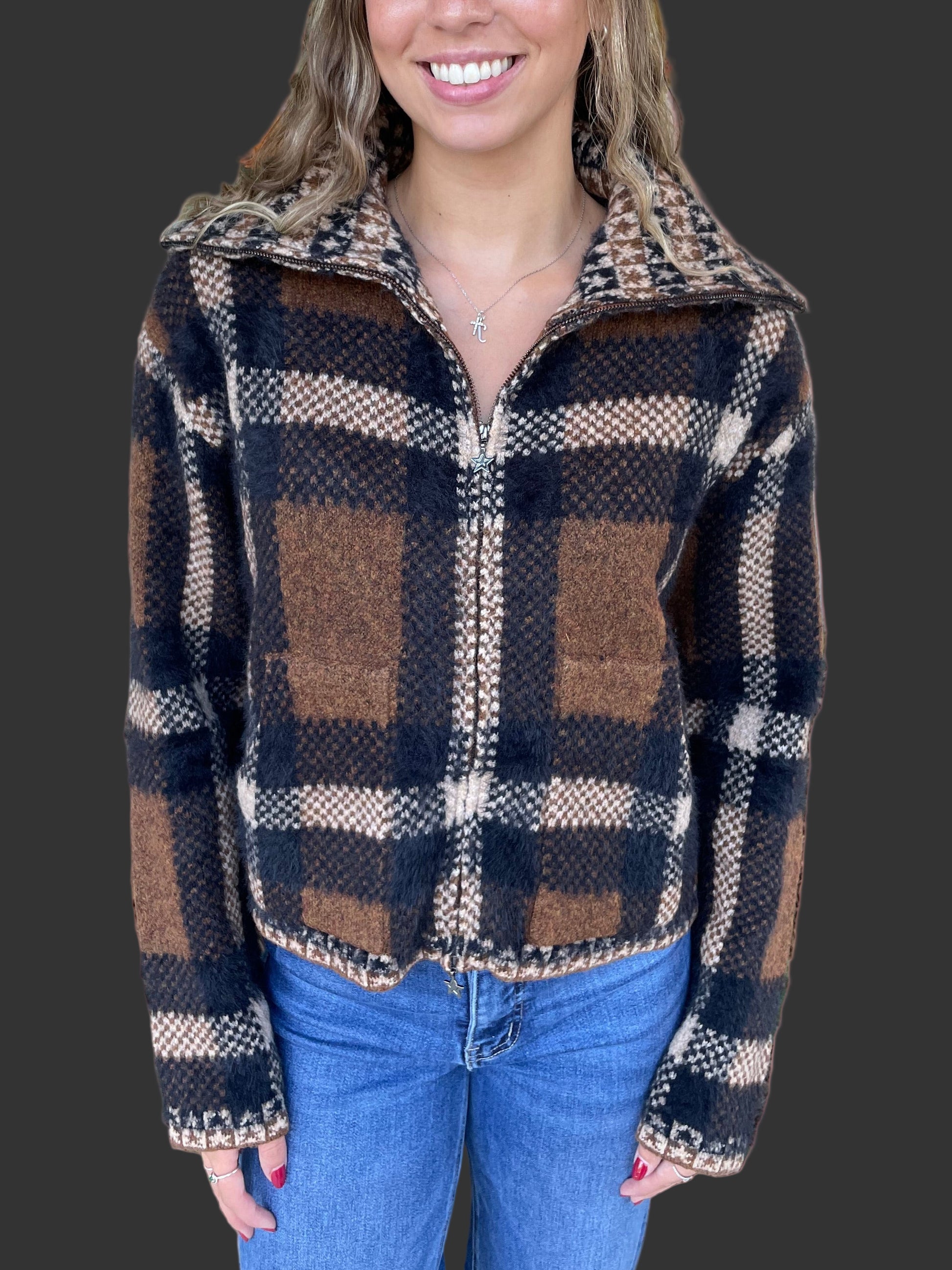 The Cherokee Bomber is your new go-to layer for effortless cool. This cozy knit jacket rocks a bold brown and black plaid pattern that pairs with everything in your closet. Zip it up to the high neck collar for extra warmth, or keep it casual and open. Functional front pockets mean your hands (and essentials) stay snug. Perfect for those in-between weather days when you want style without trying too hard.