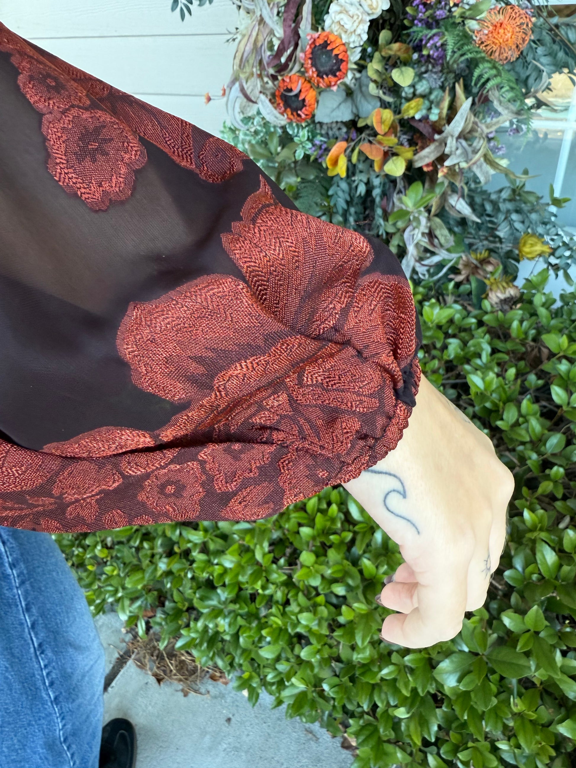 Elevate your evening look with this playful Cocktail Hour Top, featuring a stunning black and burnt orange print that commands attention. The sheer fabric is beautifully balanced with a lined body for coverage where it counts. Long sleeves finish with a charming elastic hem, while a decorative tassel tie at the neckline adds a flirty touch. Functional center front buttons with elastic loop closure make dressing effortless. Perfect for nights out or dressed-up occasions when you want to make a statement.