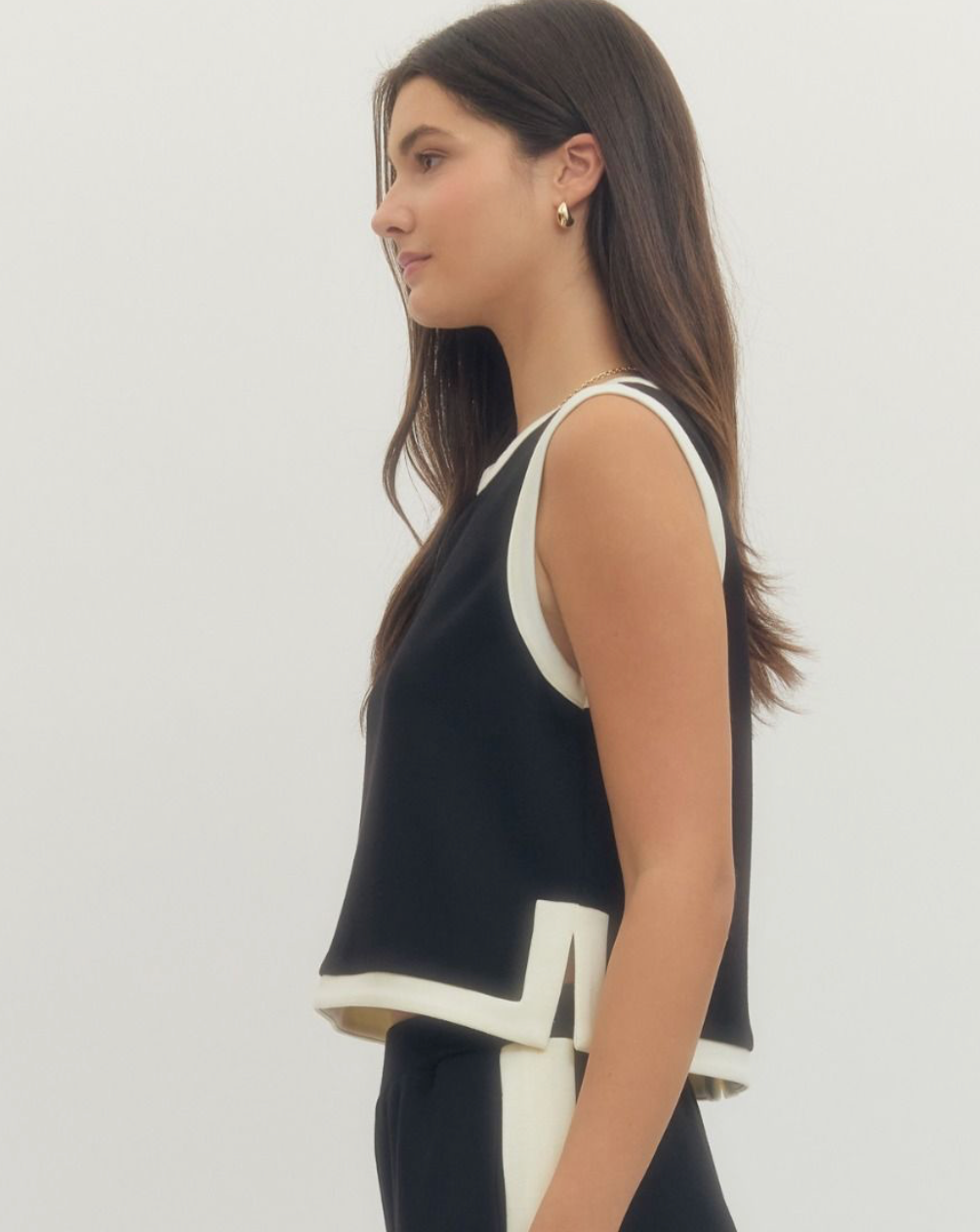 Solid sleeveless knit top featuring contrast binding and covered button closure at back. Side slit detail. Unlined. Knit. Non-sheer. Lightweight.