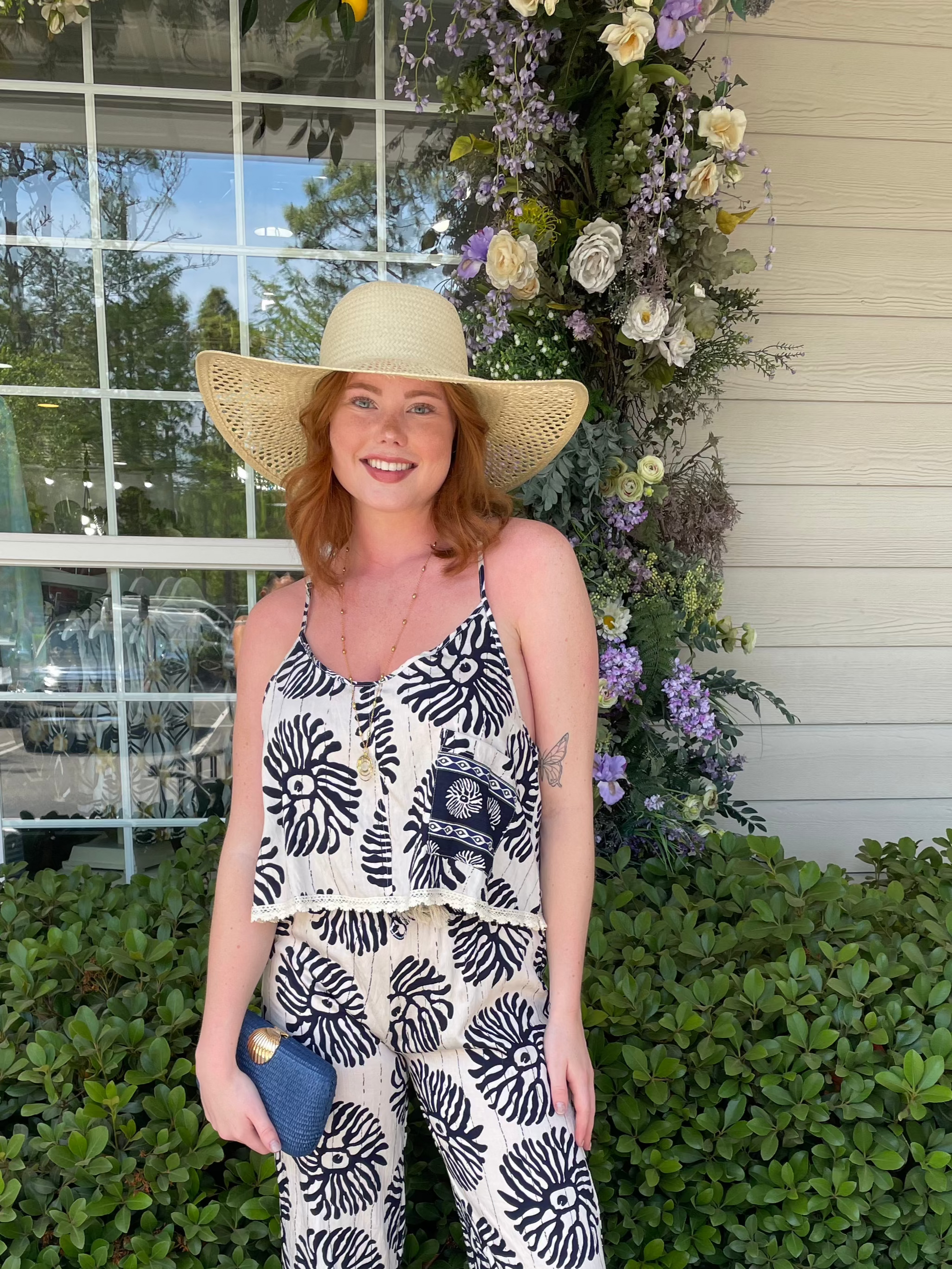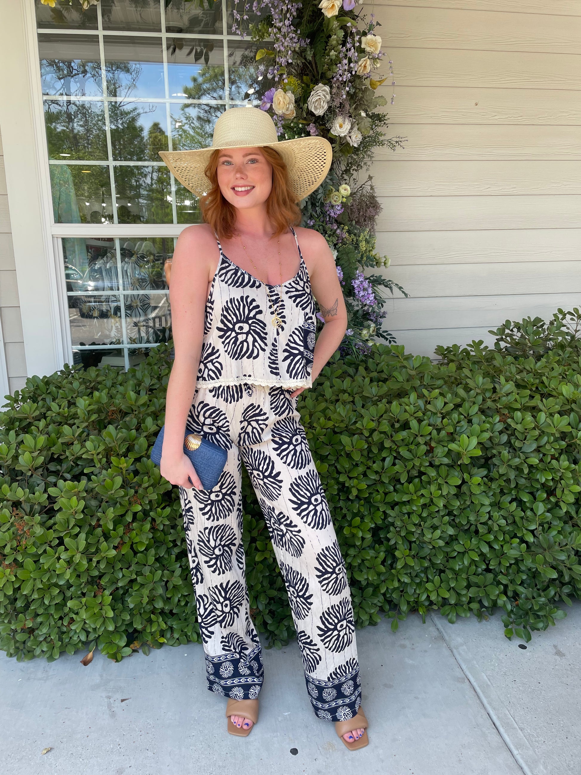 This playful halter tank offers a stylish fit with adjustable straps and a sleek blue and tan design. Perfect for warm days and casual outings, this lightweight top is a must-have for any wardrobe.