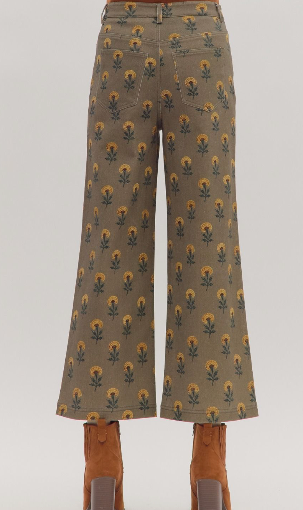 Meet your new favorite pair of jeans! These adorable cropped denims feature a cheerful marigold flower print that brings instant joy to any outfit. Cut in a flattering wide leg slim fit, they offer the perfect balance of comfort and style. Complete with a front zip closure and functional pockets, these playful pants are ready to brighten your wardrobe and turn heads wherever you go.