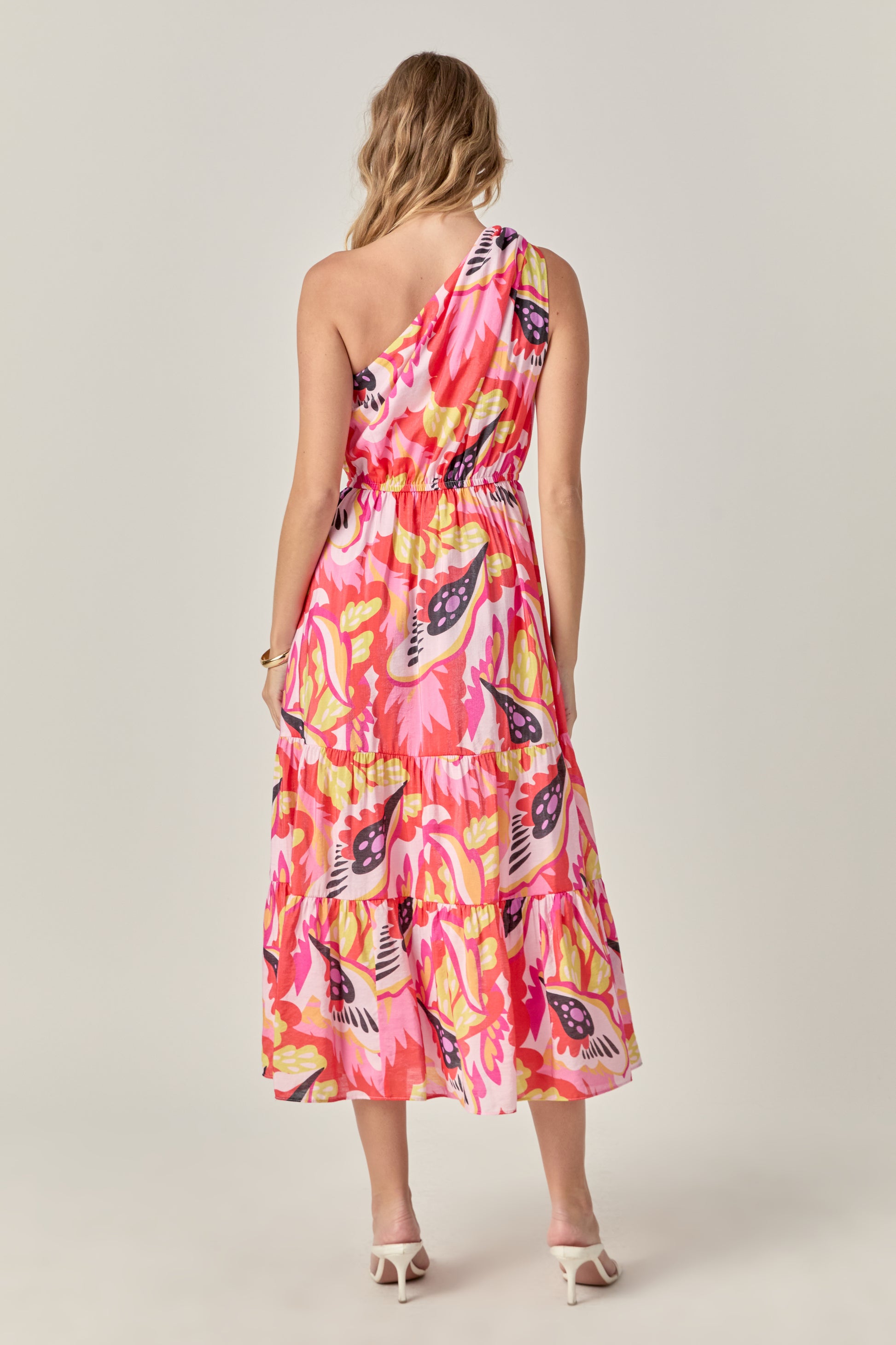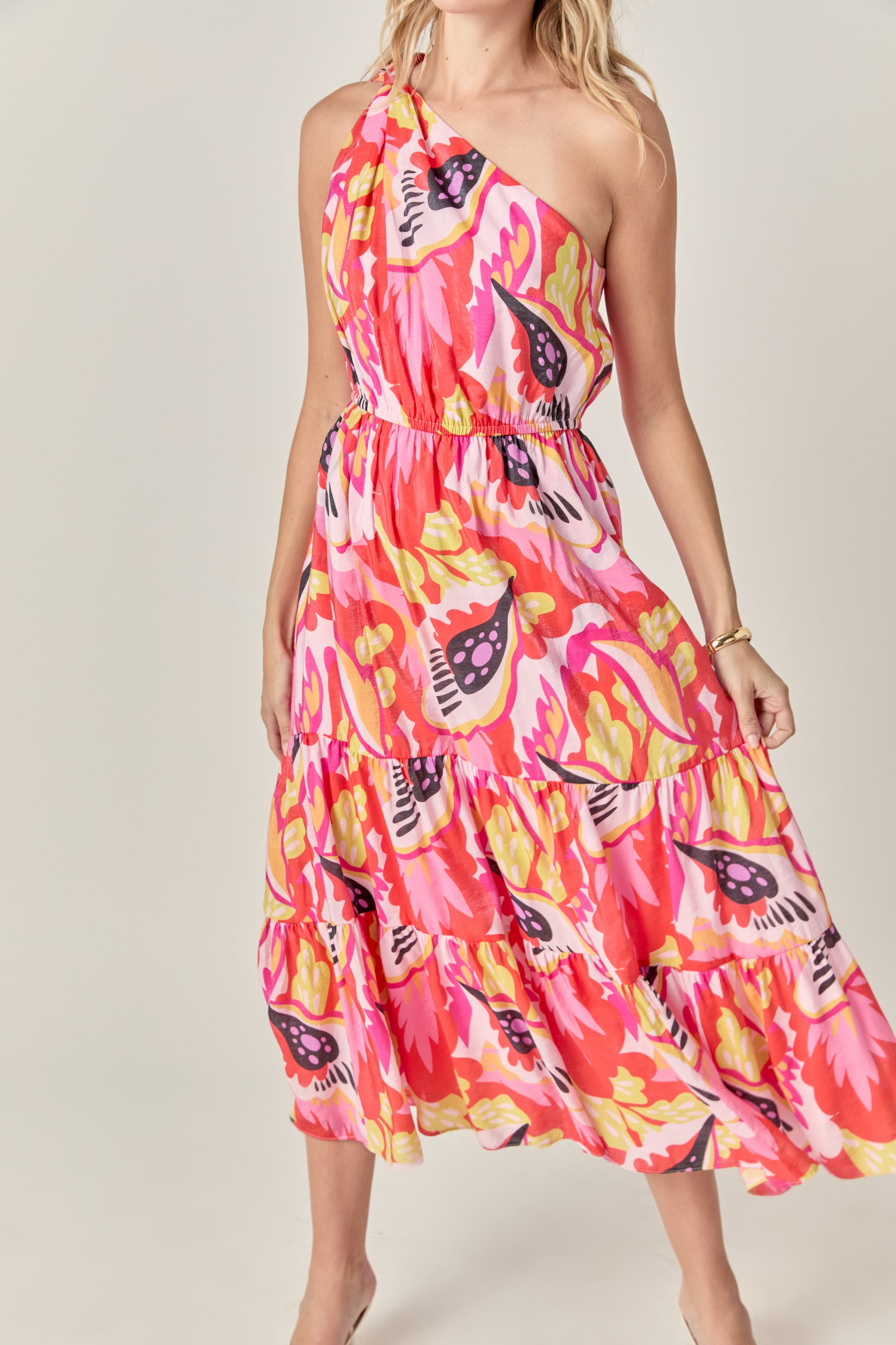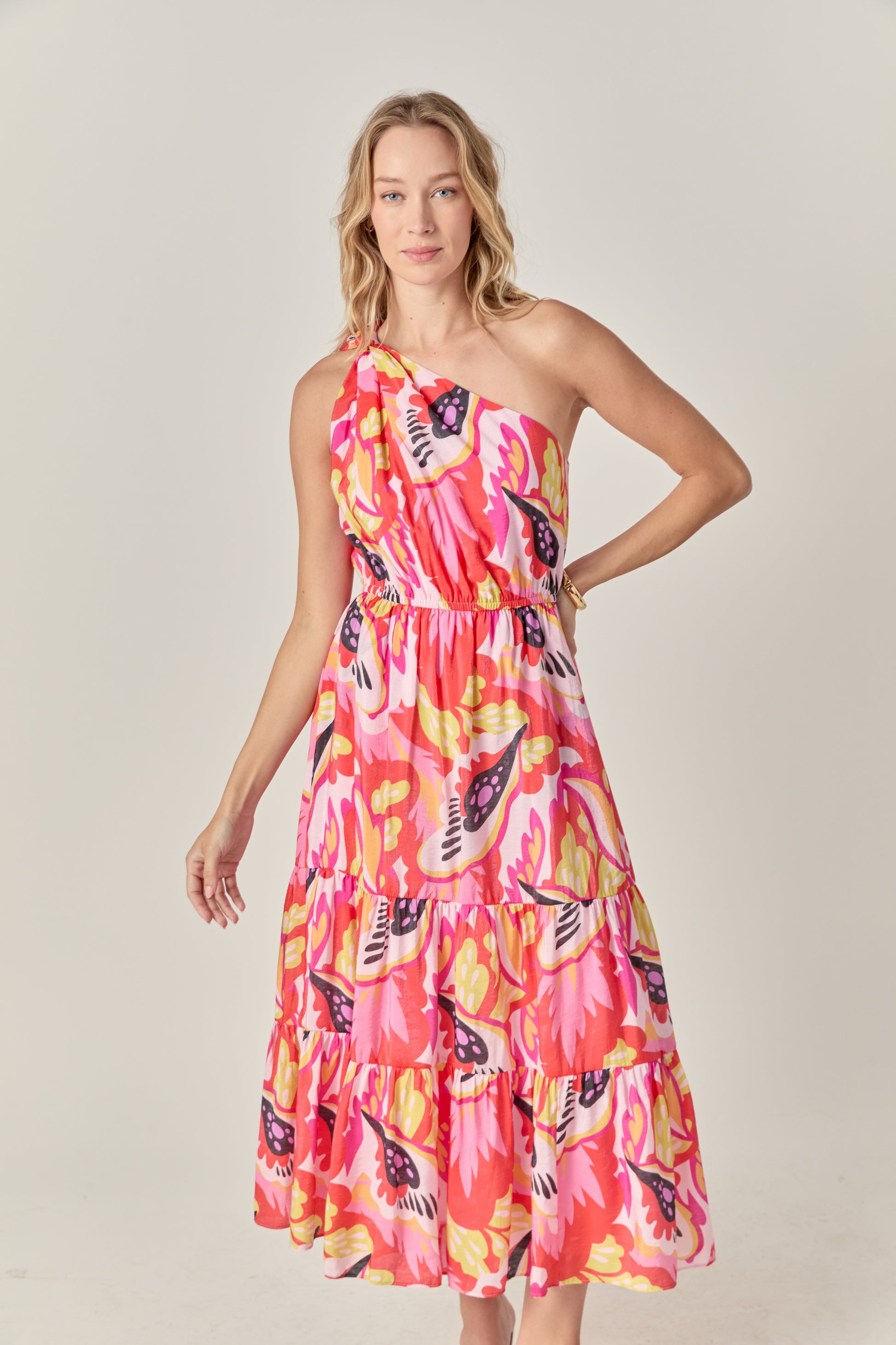 This vibrant maxi dress features a bright floral abstract print bursting with color, perfect for making a joyful statement. The playful one-shoulder design adds a touch of whimsy, while tiered panels create a flowing, dynamic silhouette that moves beautifully with you. Ideal for sunny days and festive occasions, this dress combines comfort and style effortlessly.
