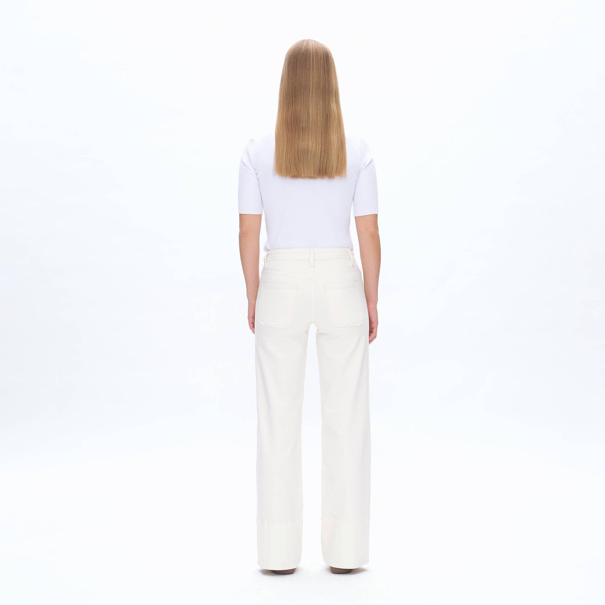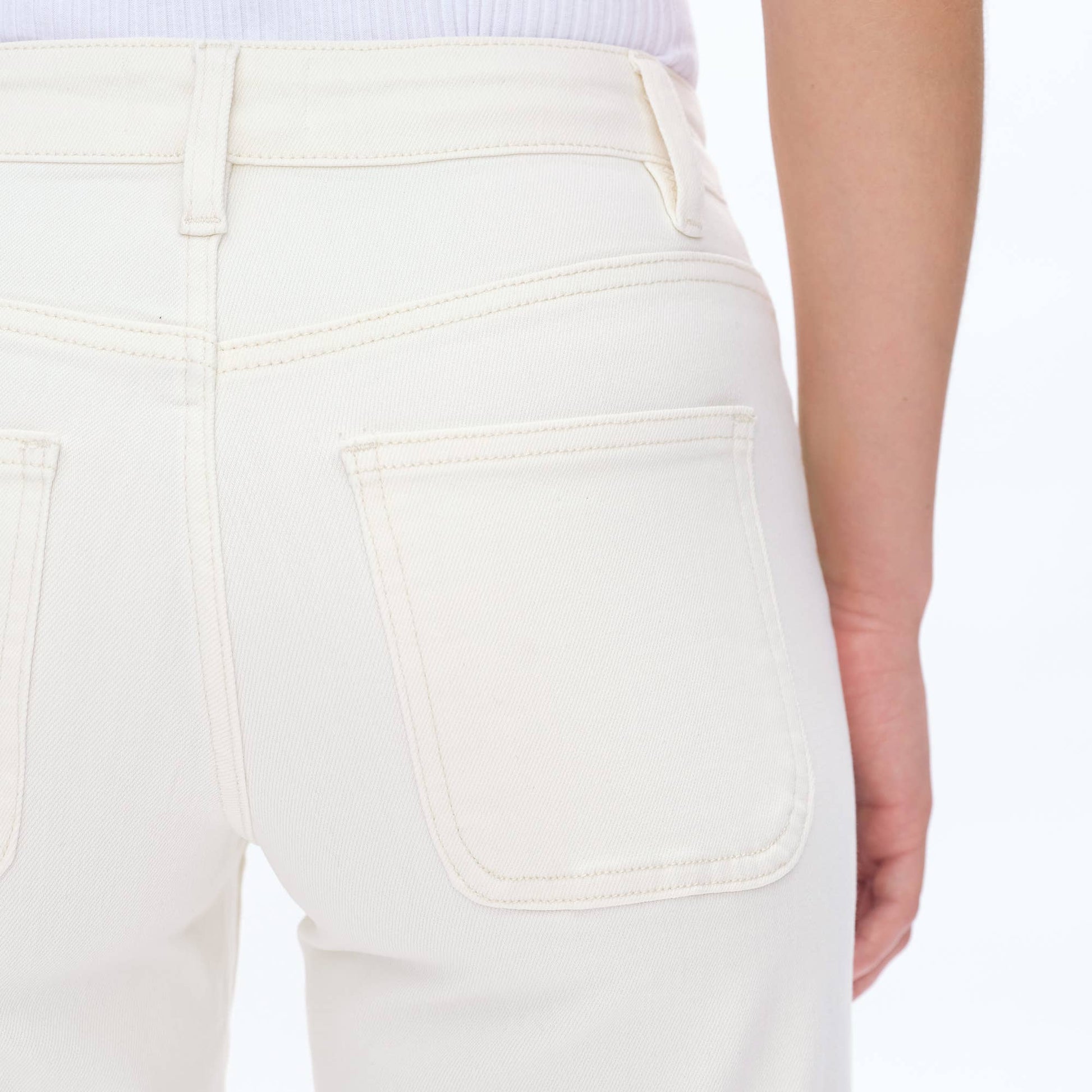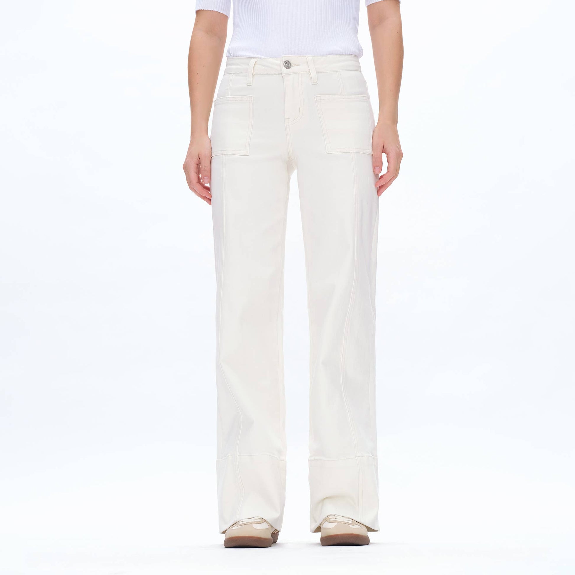 CRAFTED FROM SUPER STRETCH TWILL OFF WHITE UTILITY STYLE, FOUR POCKETS, DOUBLE PATCH POCKETS, MID RISE WAIST, ZIPPER FLY, DART DESIGN, FINISHED HEM, TWILL PANTS CARE INSTRUCTION: MACHINE WASH 26: WAIST 27 1/4'' / FRONT RISE 9 1/2'' / INSEAM 32'' MODEL IS 5' 7'' WEARING SIZE 26