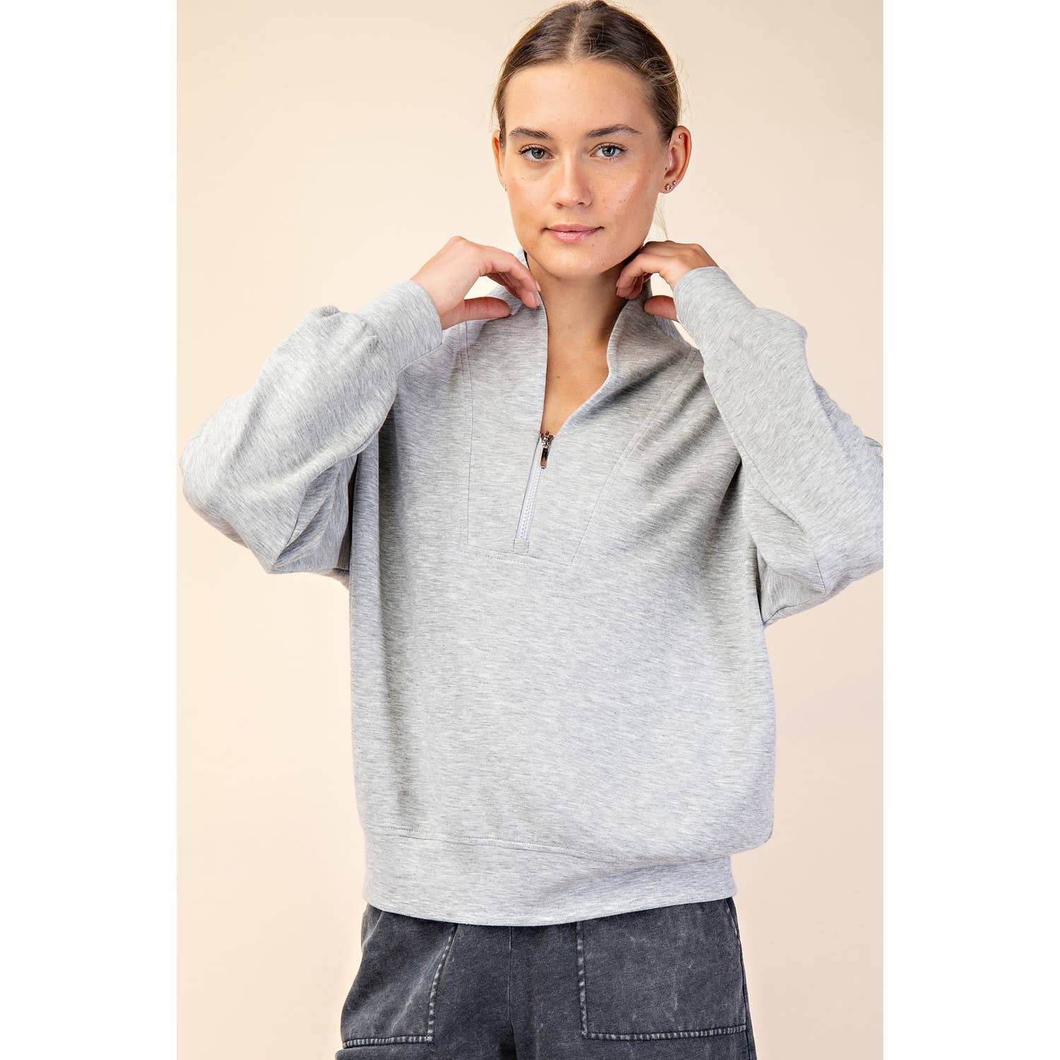 Crafted from a sumptuous, silky smooth fabric, this jacket is exceptionally soft and lightweight for a luxurious feel. The oversized fit exudes a laid-back vibe, complemented by the half zipper closure and bubbled sleeves, creating a fashion-forward look. With a convenient front pocket and dropped shoulder design, this jacket seamlessly combines comfort and trendiness. Model is 5'8" and wearing size Small.