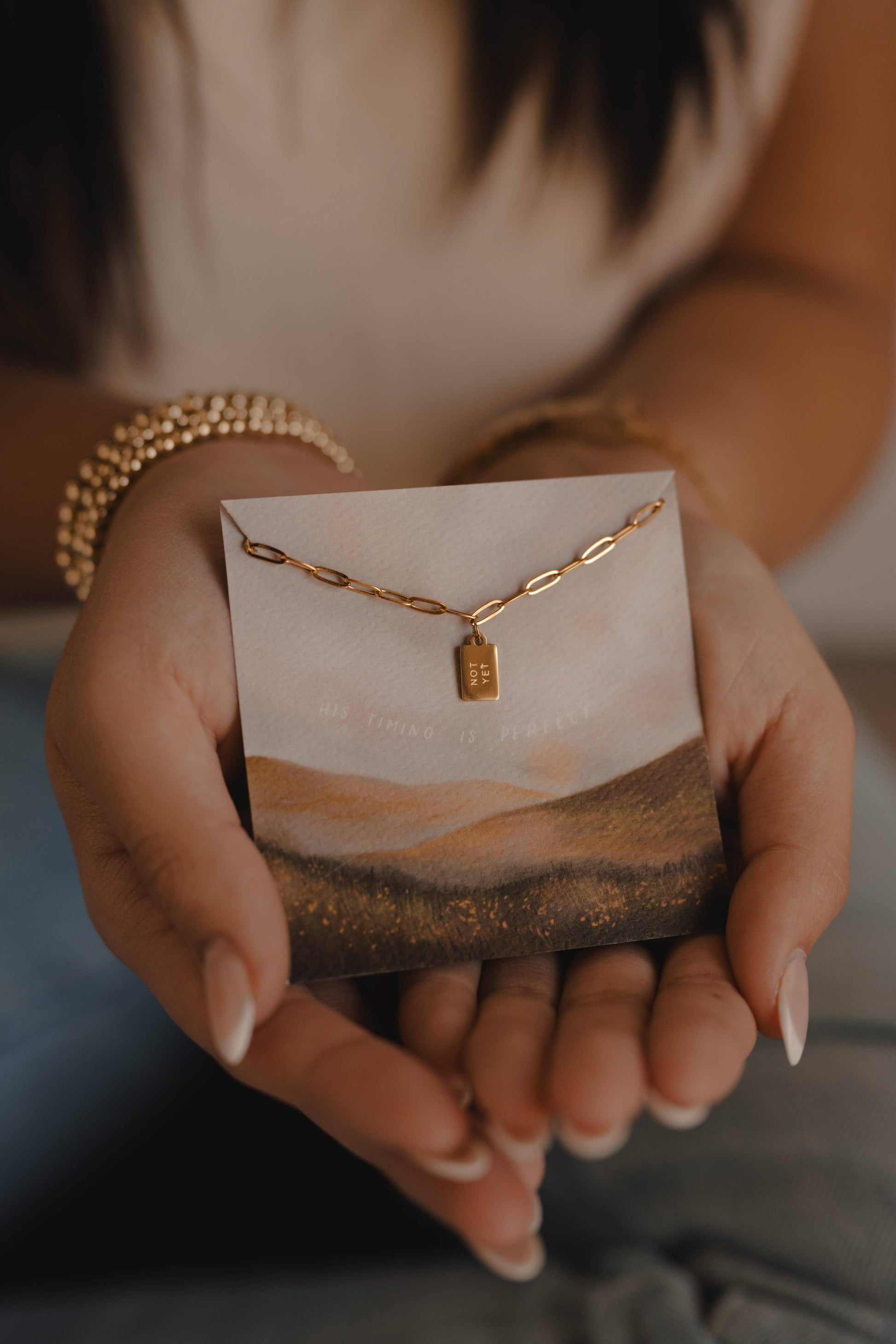 Displayed on a textured card featuring beautiful artwork by Lauren Ferguson of The Golden Designs. Full verse reference included on the back of the card.