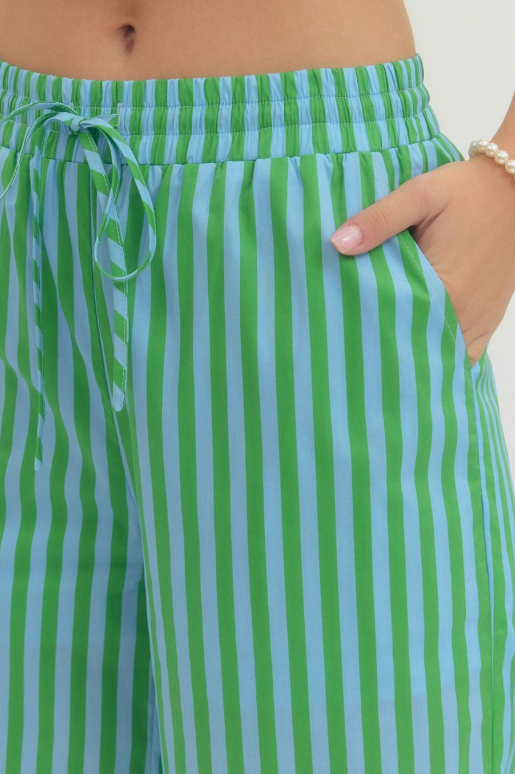 Escape into effortless style with the Paradise Pant—a fun striped wide-leg design in gorgeous blue and green hues. Featuring a comfortable elastic waist, functional pockets, and a perfectly styled back, these pants are made to pair beautifully with our matching Paradise Tank. Slip them on for a coordinated look that feels as good as it looks.