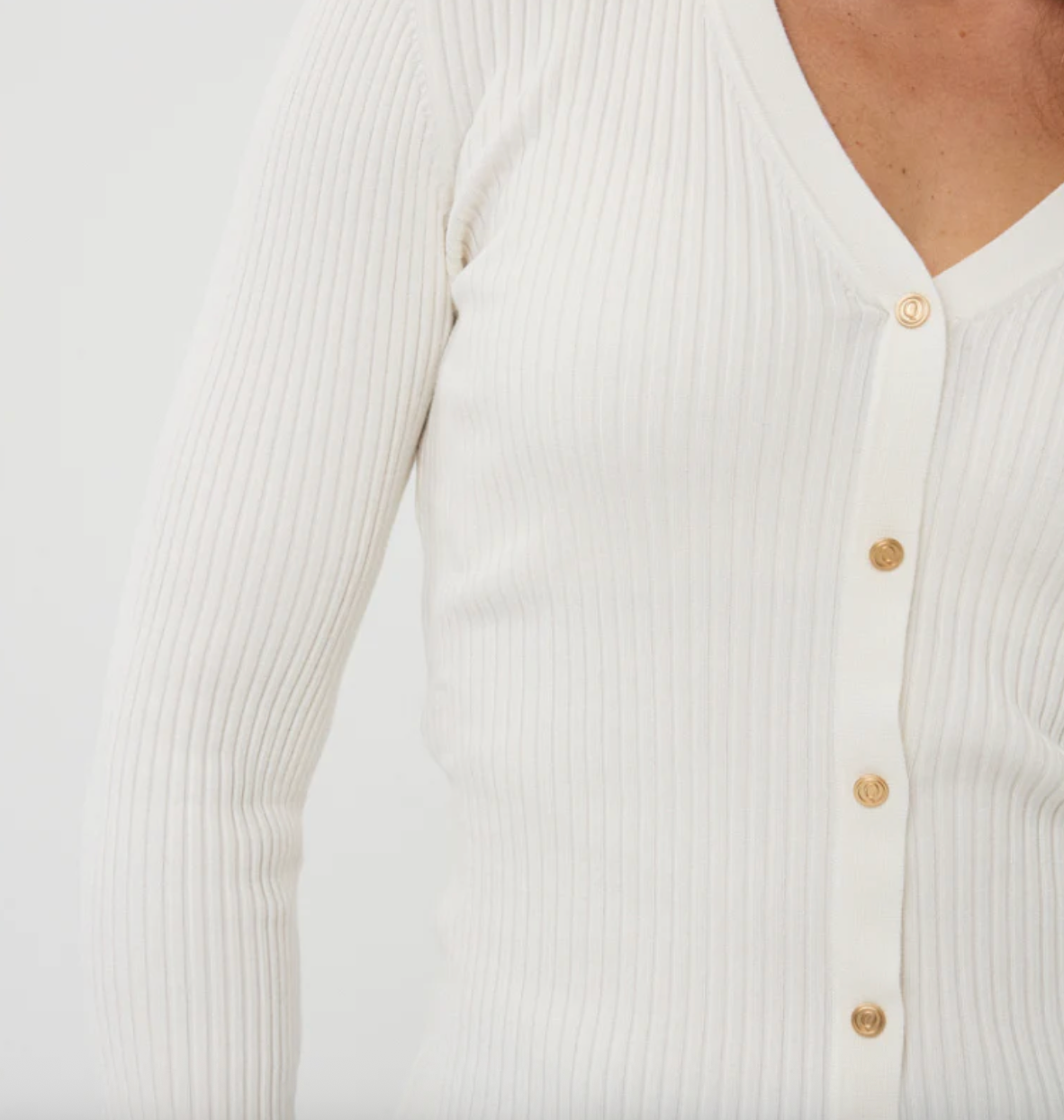 Elevate your casual look with this playful ivory fitted ribbed top. It features a chic collared V-neck and a faux front seam adorned with tiny gold buttons for a touch of sparkle. Perfect for adding a subtle statement to your outfit while keeping things comfortable and stylish.