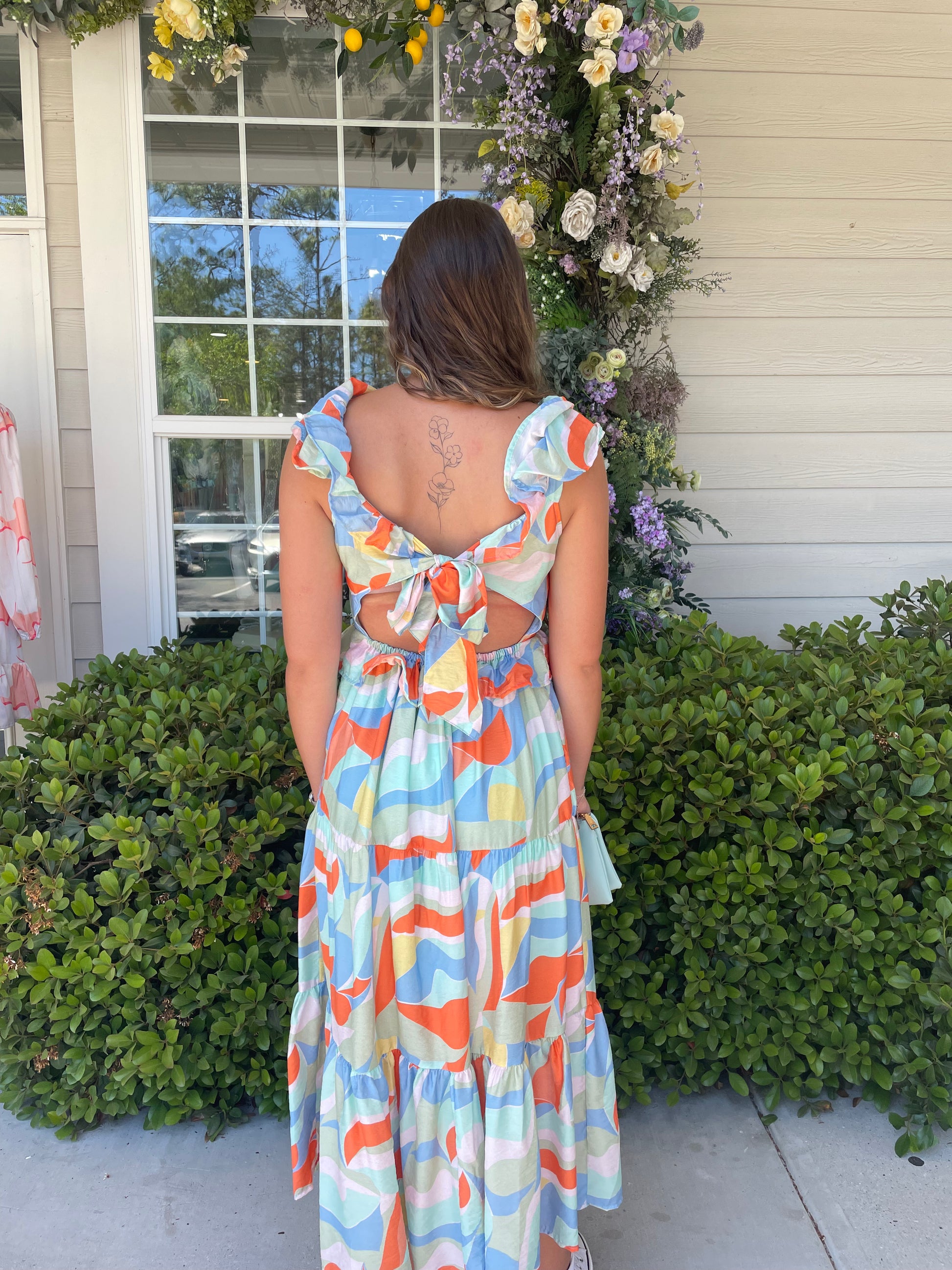 Unleash your wild side with this playful midi/maxi dress featuring shades of blues and oranges. Its ruffled straps and tied maxi panel add a touch of fun, while the tie back allows you to customize your fit. Embrace your unique style with this one-of-a-kind dress!