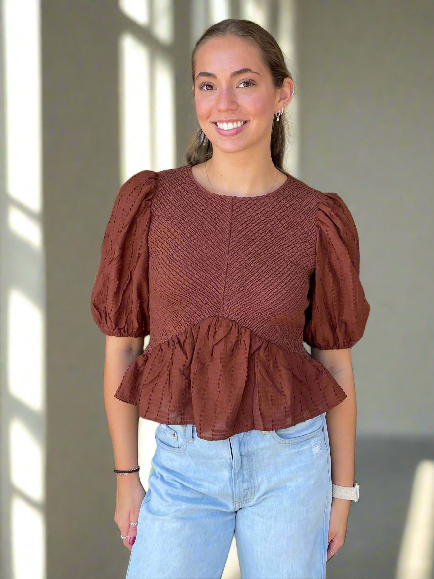 Add a touch of sweetness to your wardrobe with this Smocked Chocolate Peplum Top. Its snug smocked bodice offers a comfy, flattering fit, while the flirty peplum hem adds a fun, flouncy flair. Back Zip. The rich chocolate hue makes it perfect for mixing and matching, ready to bring playful charm to any outfit.