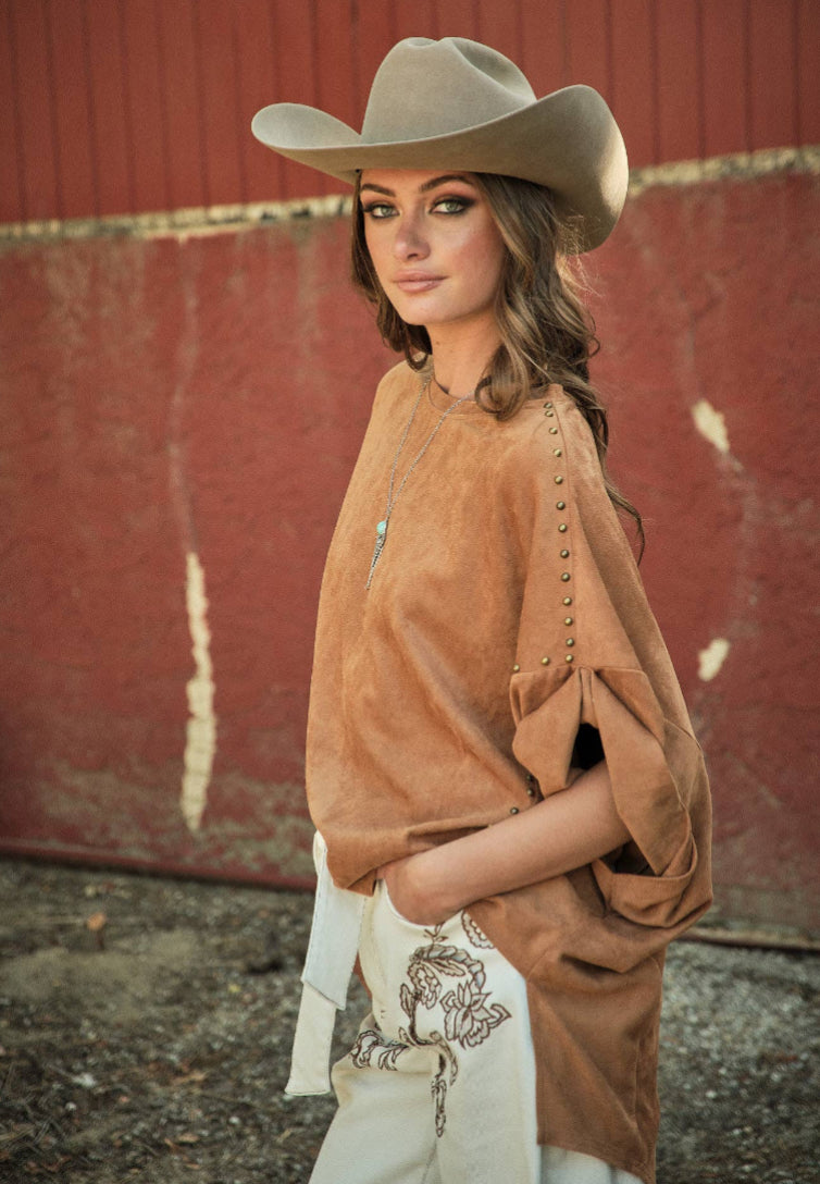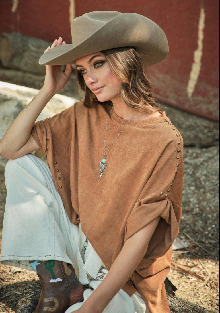 Oversized suede-look tee with side studs, rolled sleeves, and high-low hem for a relaxed western feel 95% Polyester, 5% Spandex Model is 5'8" tall and wearing size Small