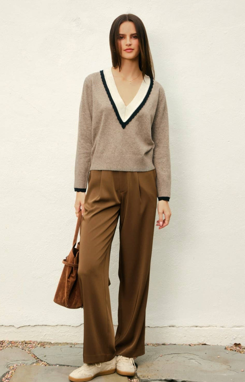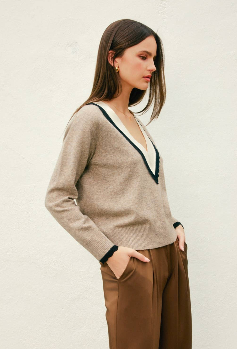 Meet your new favorite go-to: the Varsity Sweater with a playful twist. Featuring a deep V-neck framed by rib band detail and delicate lace trim, this unlined shell blends polyester, acrylic, wool, and spandex for cozy stretch and lightweight warmth. Perfect for layering or wearing solo, it promises effortless style with a hint of charm. Model is 5'9" wearing size Small.